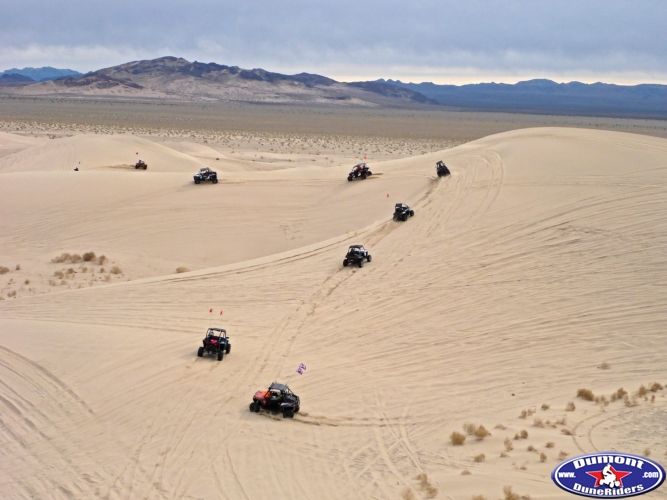 We only saw a couple groups pass by when we would stop to take a break in the dunes. It was mostly side x sides and a couple quads. The dunes were soft and dry on top and about 8" down there was some moisture from recent rain. They were smooth until later in the day on Saturday. By then we had left quite a few tracks from our buggies. The duning was great!