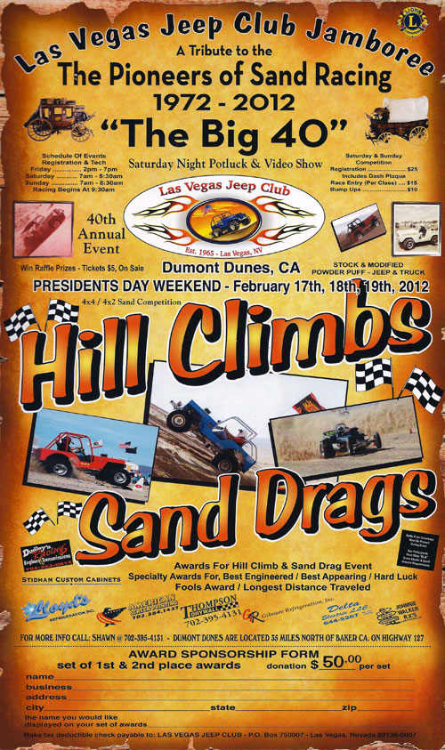 dunefreak Posted February 11, 2012 Share Posted February 11, 2012 The Las Vegas Jeep Club will be holding their 40th Anniversary Jeep Jamboree at the Dumont Dunes on February 17-19. Several Pioneers of this event will be on hand to celebrate the 40th edition. Saturday will feature the Hill Climb portion of the event while the Sand Drags will be held on Sunday. NSDN is planning on making it to this event for the first time to cover the action. View the letter below for some Racer/Sponsor Info. November 5, 2011 Dear Racers and Sponsors, The Las Vegas Jeep Club is proud to announce “A Tribute to the Pioneers of Sand Racing” with the 40th Annual Jeep Jamboree. The event will take place on Presidents Day Weekend, February 17 – 19, 2012 at Dumont Dunes, CA. The format will remain the same with Saturday Hill Climbs and Sunday’s Heads Up Sand Drags. The club is producing a DVD video to be shown Saturday night during the pot luck barbeque dinner located @ the LVJC camp. The video will explore the history of the Jeep Jamboree. If you have photos of past jamborees you would like to contribute to this DVD, please send pictures on a disc or flash drive by December 1, 2011. (Your disc/flash will be returned to you). Special awards to Raffled Class Winners and Unique trophy award concept… Congrats to last year’s Unlimited Hill Climb Winner: Dean Becker of Brush Prairie, Washington. This was Dean’s first time Hill Climbing and will he bring his WA competition buddies this year? Here are some new ET record holders for the X classes; X500 Big Block 4W Drive – John Warren with a 4.517, and Pro Drag, Tracy Malan with a 3.763. New BLM info regarding 2012 passes will not be available for purchase at the dunes. You must purchase your weekend passes in advance. For more info, call Barstow Field Office @ (760) 252‐6000. DUMONT DUNES Pass Vendors 2011‐2012 Season Kinsail Corp www.dumontdunespermits.com 3600 N. Upland St. Arlington, VA. 22207...703 994-4194 K&Y Country Store, P.O. Box 440 Baker, CA. 92309...Phone 760 733-4252 Parker MC/ATV, 301 Ox Bow #3, Pahrump, NV. 89048...Phone 775 537-6686 Grewal Travel Center, 72363 Baker Blvd., Baker, CA. 92309...Phone 760 733-4505 Valero Service Station, 71808 Baker Blvd., Baker, CA. 92309...Phone 760 733-4542 Johnnie Walker RV, 4784 Boulder Highway, Las Vegas, NV. 89121Phone....702-436-2495 General Store, Highway 127, Shoshone, CA. 92384, Phone...760 852-4224 Doghouserepair, 1371 W. Basin Ave., Pahrump, NV. 89060...775 727-9344 www.doghouserepair.com/events/dumont Carter PowerSports, 6775 South Decatur BLVD, Las Vegas, NV. 89118, Phone...702 795-2000 Trophy sponsorship form is enclosed on flyer and raffle prizes are needed. If you would like to be involved or have any questions with this historic event, please contact Shawn Thompson @ (702) 395‐4131. Mail Trophy Sponsorship to: Las Vegas Jeep Club P.O. Box 750007 Las Vegas, NV 89136 Mail Driver Packet Inserts and Door Prizes to: Las Vegas Jeep Club 5670 N. Park Street Las Vegas, NV 89149 Very truly yours and Happy Holidays! Las Vegas Jeep Club Quote Link to comment Share on other sites More sharing options...