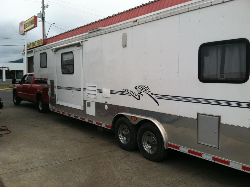 so i have been wanting to switch to a short race trailer style hauler for the last season. so a month ago i put mine up for sale (still for sale) and started shopping hard for a new one. they don't make very many short race trailers with living quarters. most are used for drag and stock cars and are 44-52 foot long. i had been casually shopping country wide and knew i was likely going to have to travel to find one. i found a couple contenders in campo cali, richland washington, new orleans and somewhere in wyoming. 2 weeks ago found one in rouge river oregon that seemed to fit the bill. after texting and chatting with the owner i decided i wanted it and started the road trip machine in motion. the trailer is a 04 that was used about 6 times. and by used i mean someone towed it somewhere 6 times. all the appliances are stainless steel and have never been used. the story i was told was it was bought in texas 3/04 hauled to northern cali. then over the next 10 years the owner twice towed his harley to sturgis in it but didn't stay in it. then last year it was traded for a piece of machine equipment. the new owner and his son added a couple of lights and put a nice rockford stereo in. then used it once for a over night where the plastic was taken off the micro and the paper and manuals were taken out of the oven and fridge. the gene is a 3000 guarden propane with 2 10# tanks with only 32 hours. so i got my money straight, serviced the truck, bought a gooseneck plate and bought tires for the trailer (they were 11 year old rotten goodyears) and took off last sunday. it was 775mile up though fallon- reno- susanville- mt shasta city- and on up i5 into oregon. if you have never taken this route north it is a nice easy drive that gets cooler and greener as you go. the stretch from susanville on around mt shasta is beautiful with many vistas, big pine trees and some cool campgrounds (haven't stayed in the area but i have explored many of the campgrounds in the big trees). then the drive on i5 into oregon and over the siskiyou pass steep long and curvy. dropping down to the rouge river valley. thats where i picked up the trailer monday morning after staying in medford sunday night. after inspecting the trailer and hooking it up i had to go 22miles back to medford with those rotten old tires. i just cruz controlled it at 50 mph and stared at the mirror waiting to see tire shrapnel. ended up making it to the tire shop where they said the tire came apart on the tire machine as it unmounted. so i headed on north to fallon for a night of blacktop boon docking at walmart. then home Tuesday morning. i guess i like towing the worst hills and and mountain roads to get familiar with a new rig. (last one i bought in bakersfield and headed up tehachapi pass) was a uneventful 1600 mile road trip very happy with the trailer and it should last me a long time.